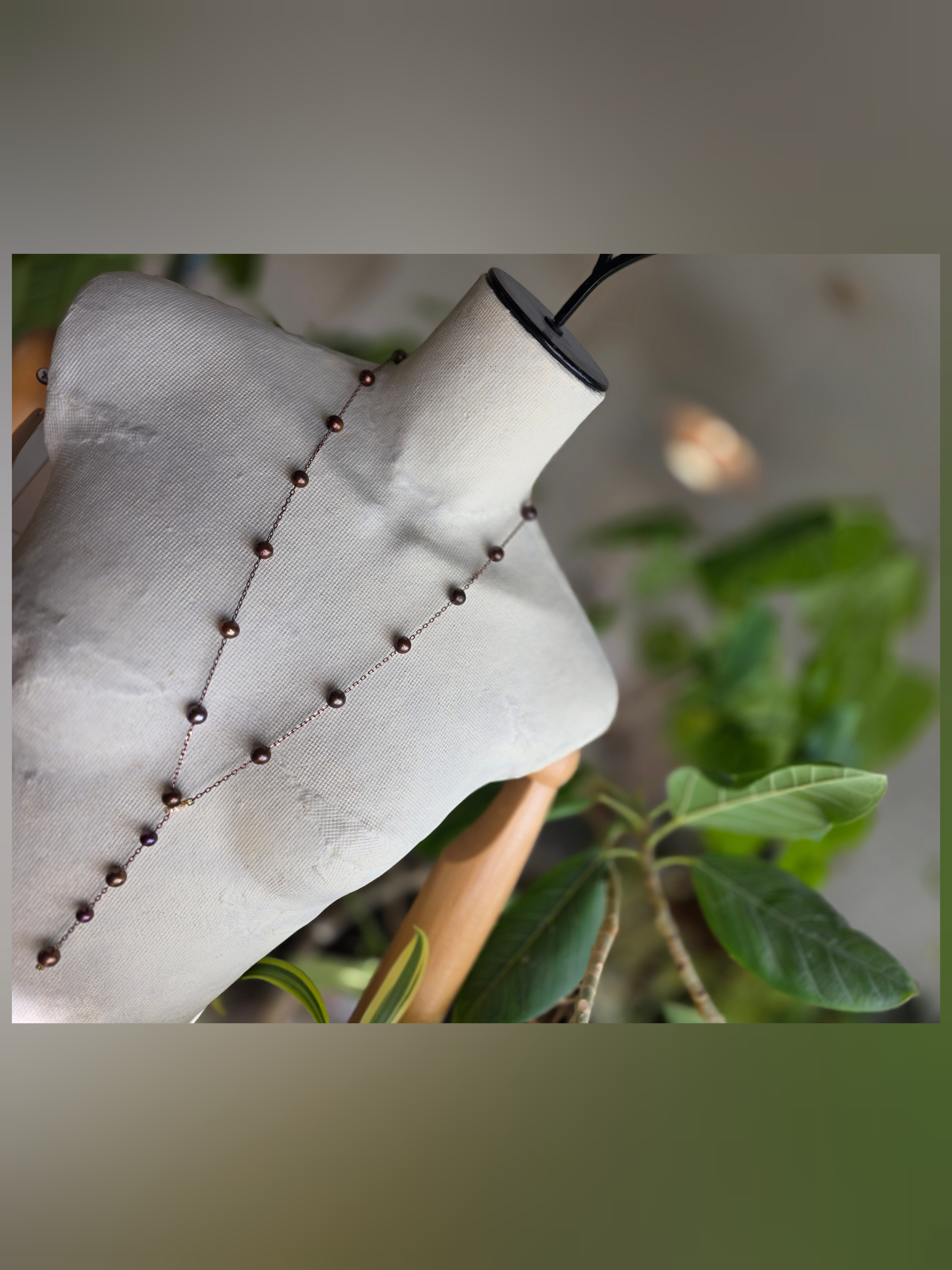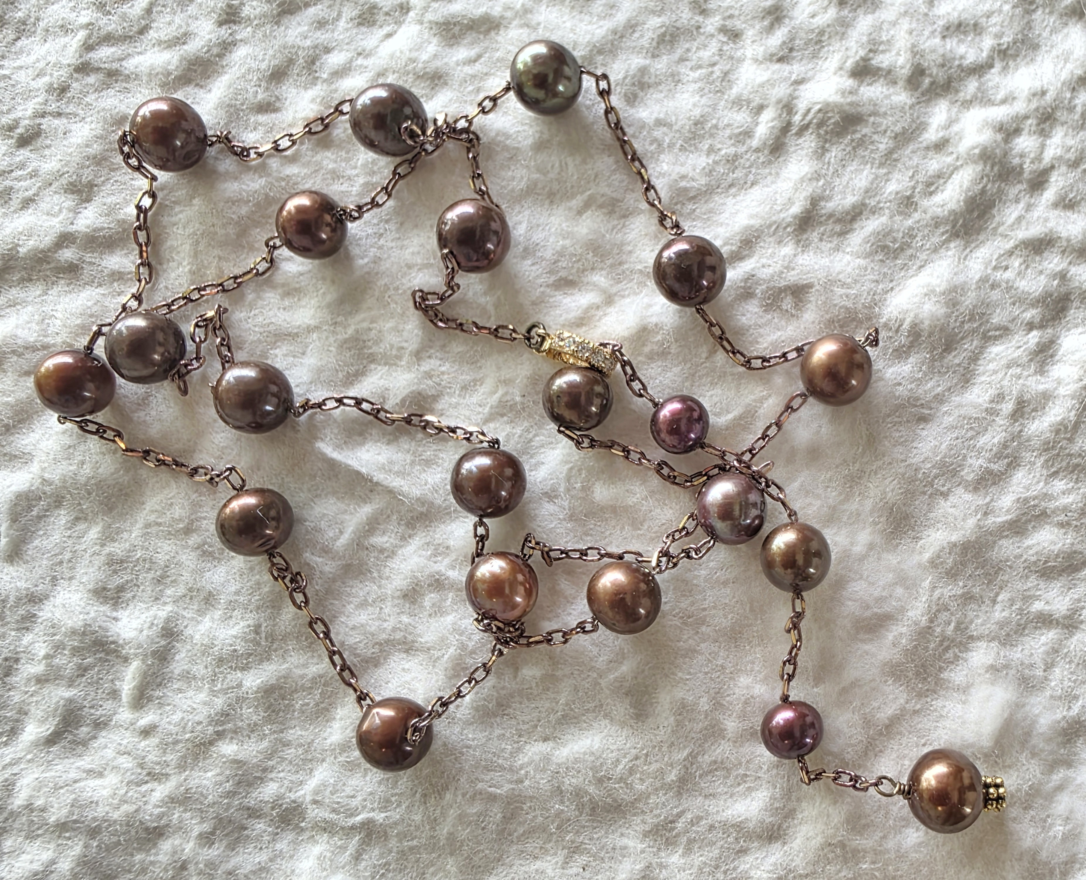 ほぼ丸に近い9mmサイズの淡水パールを使ったステーションネックレス。初めての技法でワイヤーでチョコレート色のチェーンに留め付けて作ります。